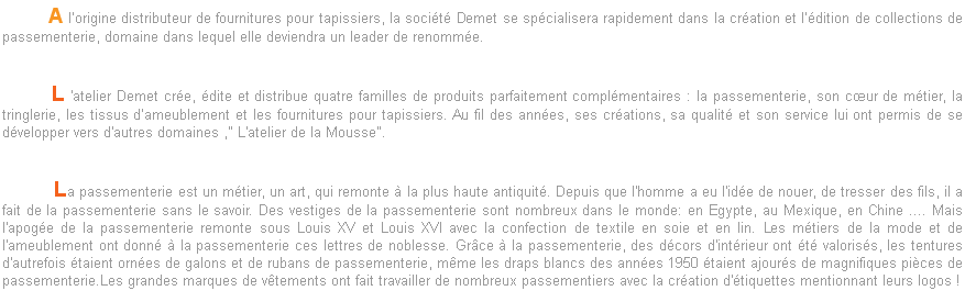 L’Atelier Demet distributeur de fournitures pour tapissiers à Toulouse, Laurent Demet se spécialisera rapidement dans la création et l’édition de collections de passementerie, domaine dans lequel il deviendra un leader de renommée. Demet crée, édite et distribue quatre familles de produits parfaitement complémentaires : la passementerie, son cœur de métier, la tringleriez, les tissus d’ameublement et les fournitures pour tapissiers. Au fil des années, ses créations, sa qualité et son service lui ont permis de se développer vers d'autres domaines ," L'atelier de la Mousse". La passementerie est un métier, un art, qui remonte à la plus haute antiquité.